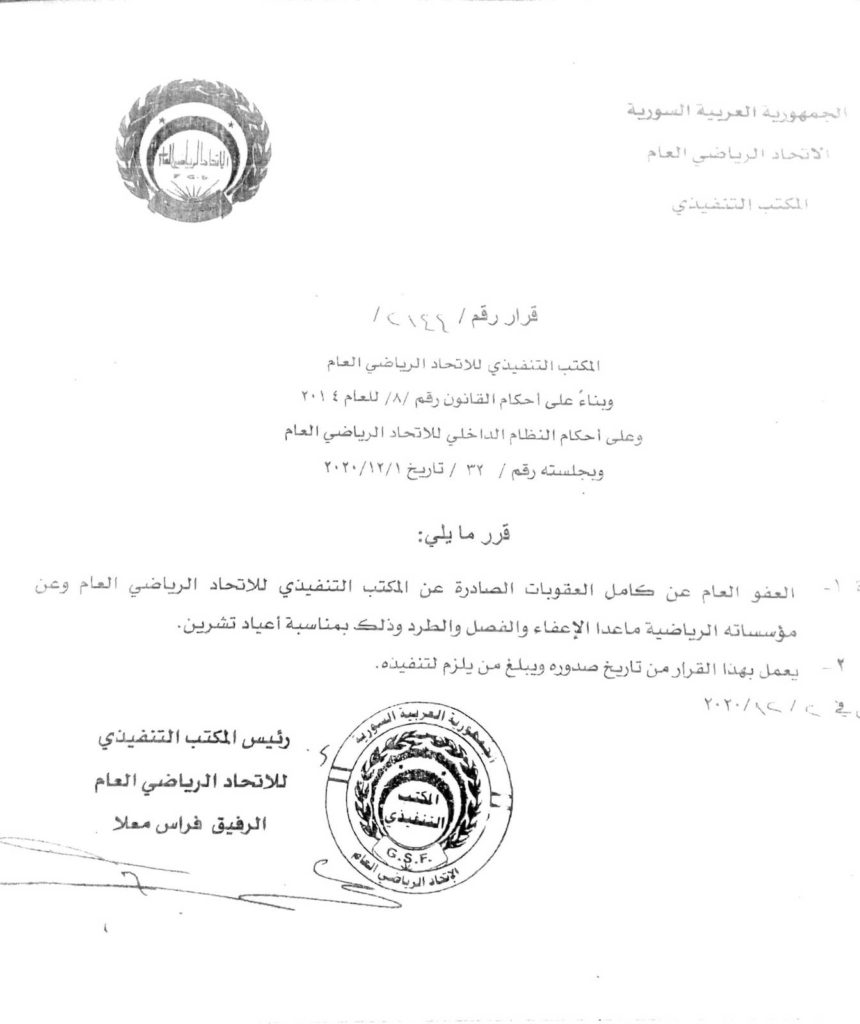 وسيسري العفو على جميع الإداريين والمدربين واللاعبين المعاقبين وأبرزهم مهاجم المنتخب السوري لكرة القدم عمر خريبين.