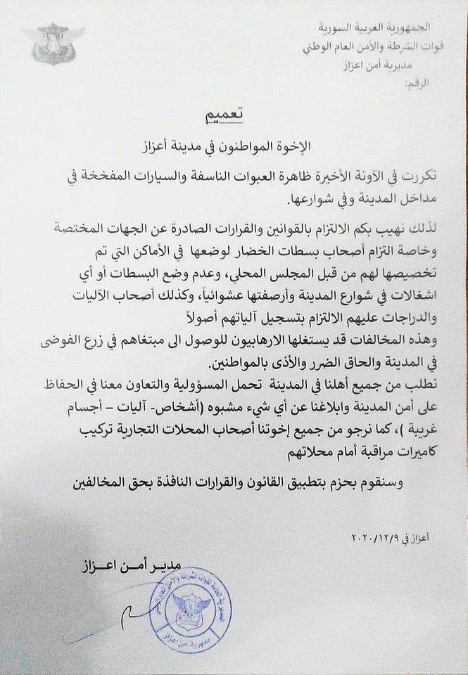 طالبت قوات الشرطة والأمن الوطني التابعة للمجلس المحلي لمدينة اعزاز، شمالي حلب من الأهالي الالتزام بعدة تعليمات للحد من التفجيرات المتكررة في المدينة.